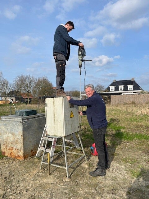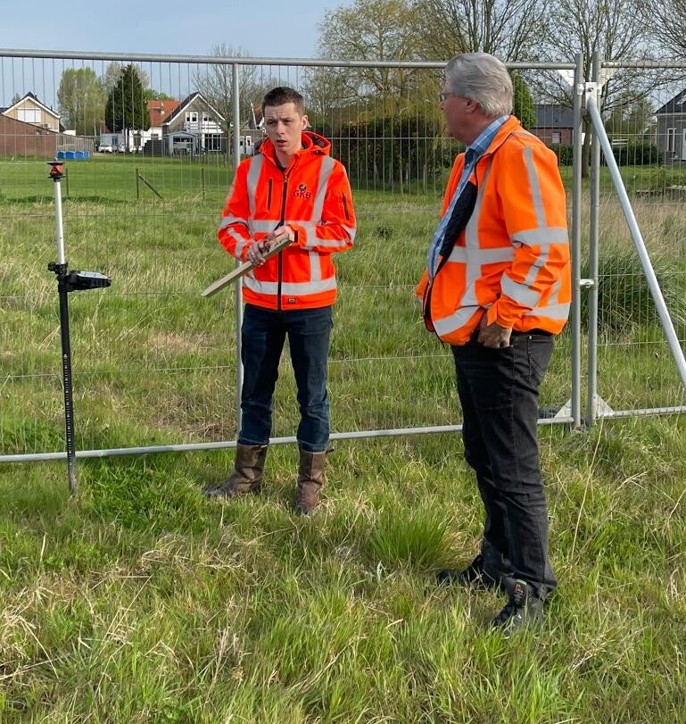Je ziet hier Edwin in actie: waar komt de fundering, hoe diep moet er uitgegraven worden en wat moet de dorpelhoogte zijn. Het indrukwekkende GPS apparaat “works its magic”. Edwin zien we weer terug als de positie van de heipalen bepaald gaat worden. Wordt vervolgd.